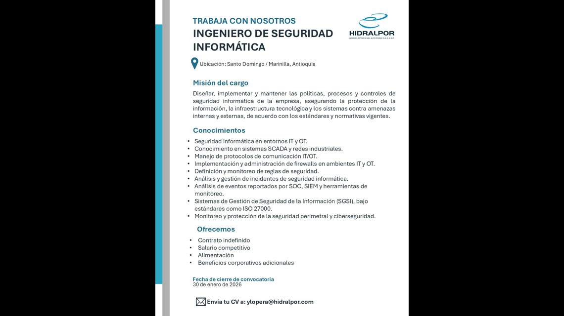 En Hidralpor nos encontramos en la búsqueda de un Ingeniero de Seguridad Informática para la gestión y protección de entornos IT y OT, con énfasis en sistemas industriales.